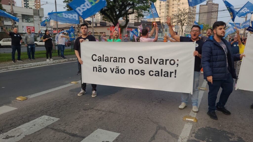 Pouco depois das 17h, cerca de 100 pessoas já estavam concentradas carregando bandeiras do PSD e faixas de apoio ao prefeito Clésio Salvaro, preso na manhã desta terça-feira (3) na Operação Caronte.
