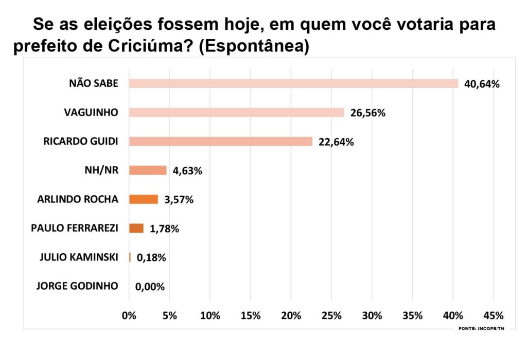 Pesquisa eleitoral contratada pelo jornal Tribuna de Notícias junto ao Instituto Catarinense de Opinião Pública e Estatística (Incope), e divulgada na manhã deste sábado (28), aponta a liderança de Vaguinho Espíndola (PSD) na disputa à prefeitura de Criciúma.