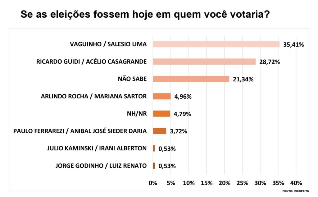 A pesquisa Incope / Tribuna de Notícias tem margem de erro de 4% e nível de confiança de 95%. Foram ouvidos 598 eleitores. O número de registro é SC-00355/2024.