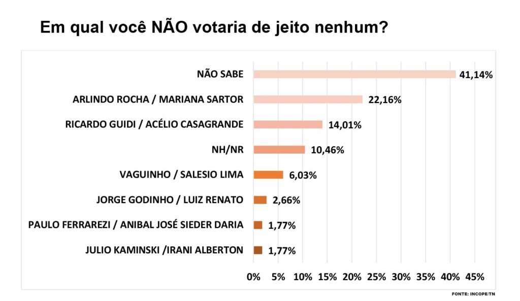 Quando a pergunta foi “em qual você não votaria de jeito nenhum”, Arlindo Rocha tem 22,16%. Ricardo Guidi, 14,01%. Na sequência aparecem Vaguinho (6,03%), Jorge Godinho (2,66%), Paulo Ferrarezi (1,77%) e Júlio Kaminski (1,77%). Os que não sabem somam 41,15% e os que optaram por nenhum deles ou não responderam, 10,46%.