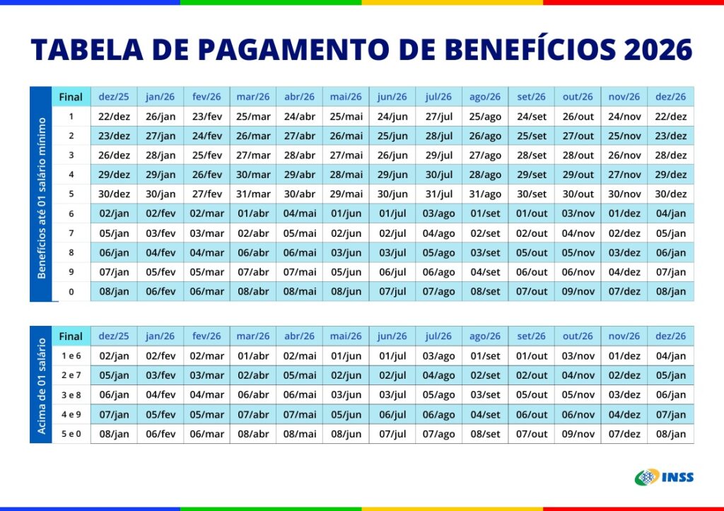 Para quem recebe até o salário mínimo, o calendário de janeiro começa com os benefícios de final 1, no dia 26 de janeiro. Para quem recebe acima desse valor, o cronograma inicia com os benefícios de finais 1 e 6, com pagamento em 2 de fevereiro.