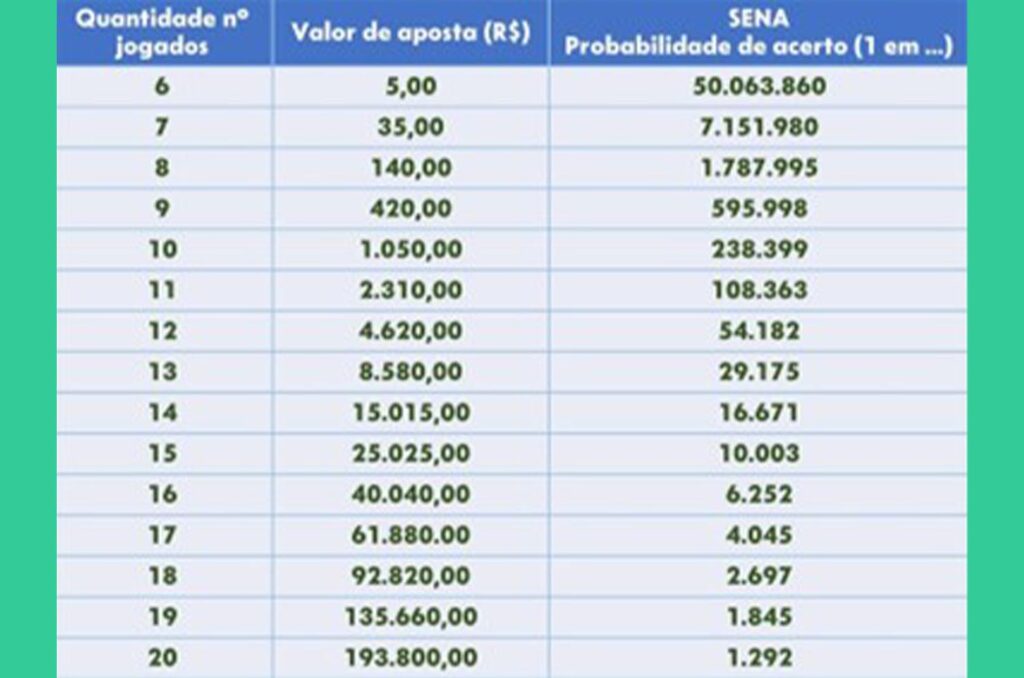 O quadro abaixo traz a probabilidade de acerto em relação à quantidade de números jogados e o valor da aposta: