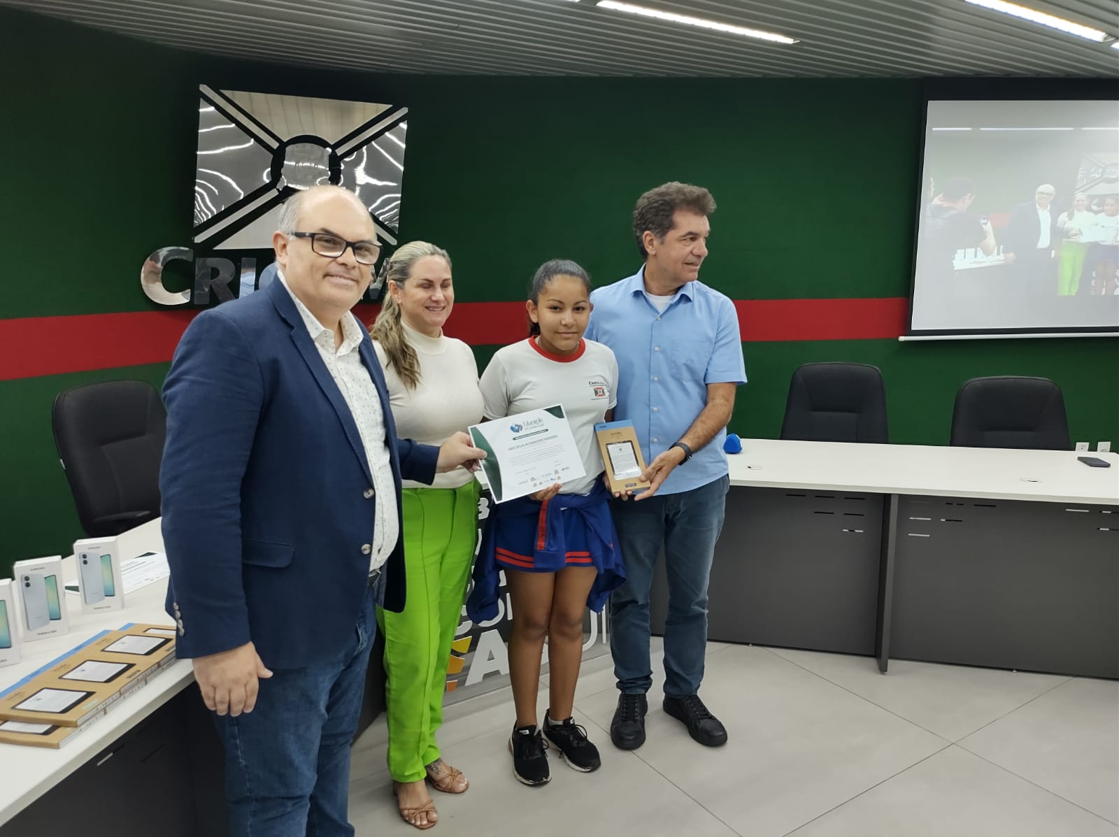 Já os estudantes do nono ano receberam o certificado e cada um também recebeu um smartphone. Confira os nomes dos alunos que se destacaram com as melhores médias da rede municipal de ensino: