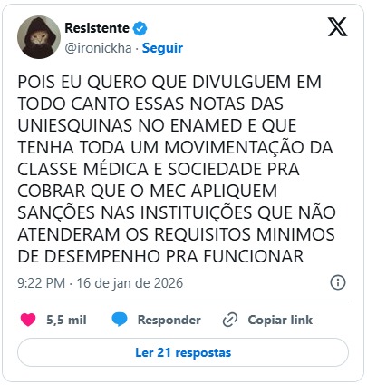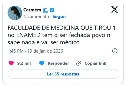 A divulgação das notas do Enamed (Exame Nacional de Avaliação da Formação Médica), nesta segunda-feira (19), provocou forte repercussão nas redes sociais e levantou questionamentos sobre a qualidade do ensino médico no país. O exame, realizado pelo Ministério da Educação (MEC) em parceria com o Ministério da Saúde, apontou que 99 cursos de medicina não alcançaram a nota mínima exigida.