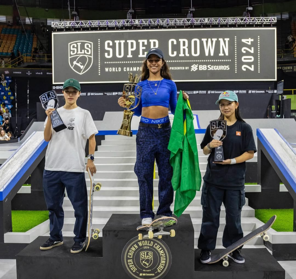 Rayssa Leal, a maranhense de 16 anos, fez história novamente neste domingo (15), ao se tornar a primeira atleta brasileira a conquistar o tricampeonato na Liga Mundial de Skate Street (SLS). Com dificuldades nas duas primeiras manobras, Rayssa estava atrás no placar, mas conseguiu uma virada impressionante ao cravar nota 9.1 na quinta e última chance da competição final. O Ginásio Ibirapuera foi ao delírio ao ver a jovem brasileira vencer a disputa de virada contra quatro japonesas, duas delas campeãs olímpicas, e uma australiana.
