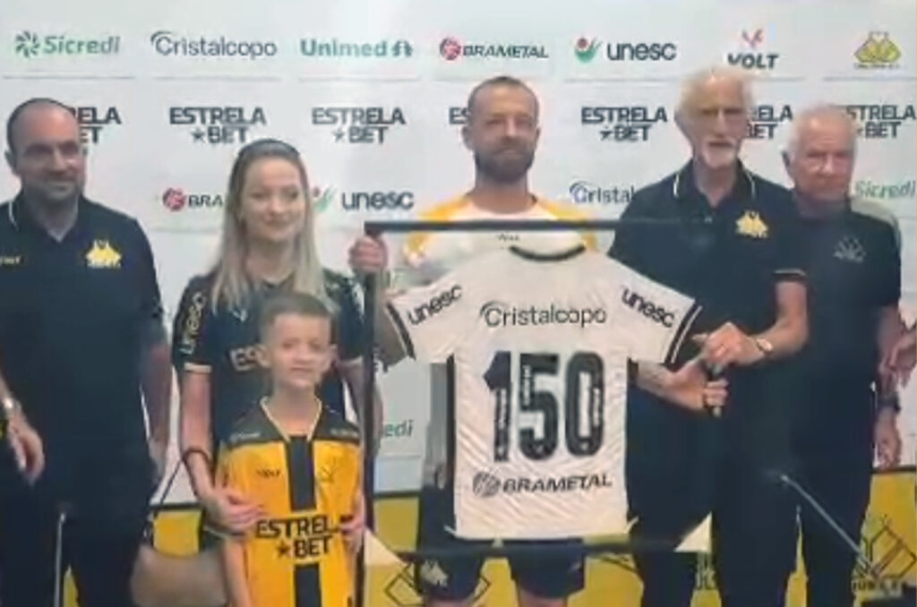 A homenagem ocorreu pouco antes do aquecimento, por volta das 17h30min, na sala de imprensa Clésio Búrigo, nas dependências do estádio Heriberto Hülse. Acompanhado dos seus familiares, o atleta recebeu uma placa comemorativa e a camisa alusiva a marca das mãos do presidente Valter Minotto e de diretores do clube.