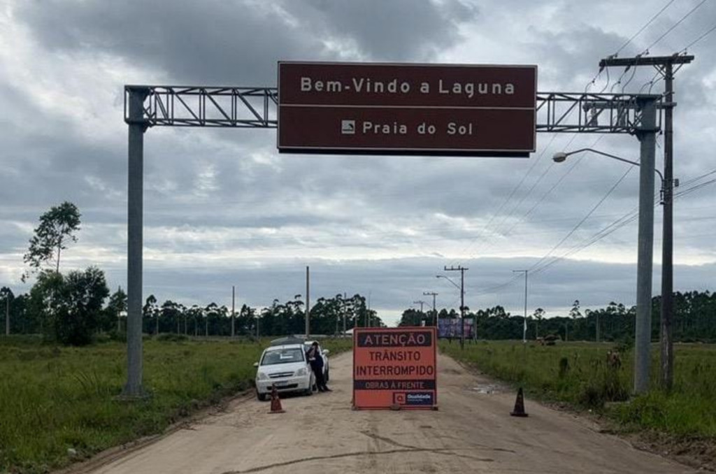 O trecho que dá acesso à Praia do Sol, em Laguna, através da BR-101, está interrompido devido às obras de pavimentação asfáltica da estrada.