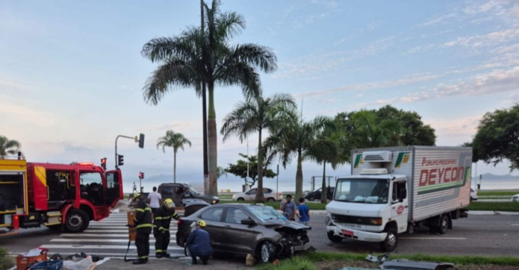 Uma colisão entre um carro e um caminhão deixou um casal ferido na manhã desta sexta-feira (7) na Beira-Mar Norte, em Florianópolis. O acidente ocorreu no cruzamento com a Avenida Professor Othon Gama D’Eça, e envolveu um Ford Ka, no qual o casal estava. De acordo com informações da Guarda Municipal, ambos os ocupantes do veículo ficaram presos nas ferragens.