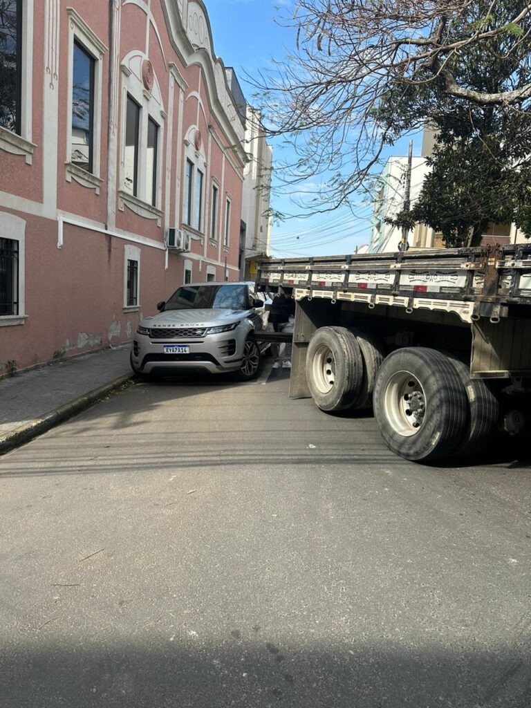 Na manhã desta quinta-feira (15), uma colisão, sem feridos, envolvendo um carro (Range Rover), e um caminhão deixou o tráfego de veículos parado na Rua 27 de Maio, no Centro de Tubarão.
