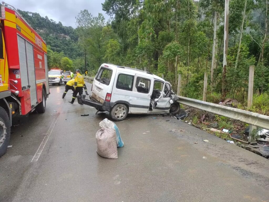 Segundo os bombeiros, uma passageira da minivan, que estava no banco do carona dianteiro, foi encontrada consciente, mas desorientada, com fraturas na perna esquerda, braço direito e diversos ferimentos pelo corpo.