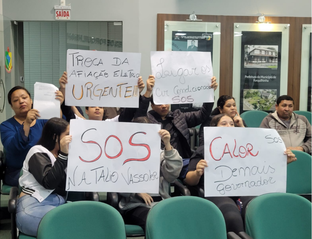 Os alunos da Escola Estadual Natálio Vassoler, junto com os pais, estiveram na Câmara de Forquilhinha para solicitar apoio na cobrança de melhorias na escola. Eles procuraram os vereadores nesta segunda-feira (23), os estudantes confeccionaram cartazes para explicar a situação da escola e agora esperam articular alguma solução.