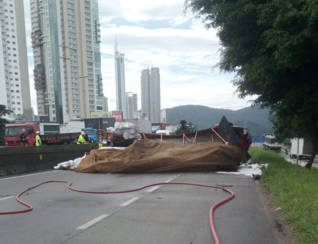 Na manhã desta quarta-feira (28), equipes de emergência de Balneário Camboriú atenderam a um acidente envolvendo o tombamento de um caminhão na BR-101. Inicialmente, havia suspeita de que o veículo transportasse produtos perigosos, o que não se confirmou no local.