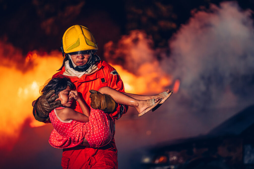 Firefighter in Action, Protecting People from Fire and Smoke. Fearless Firefighter Rescues Girl from Raging Fire and Smoke. Brave Firefighters Save Lives in Danger.
