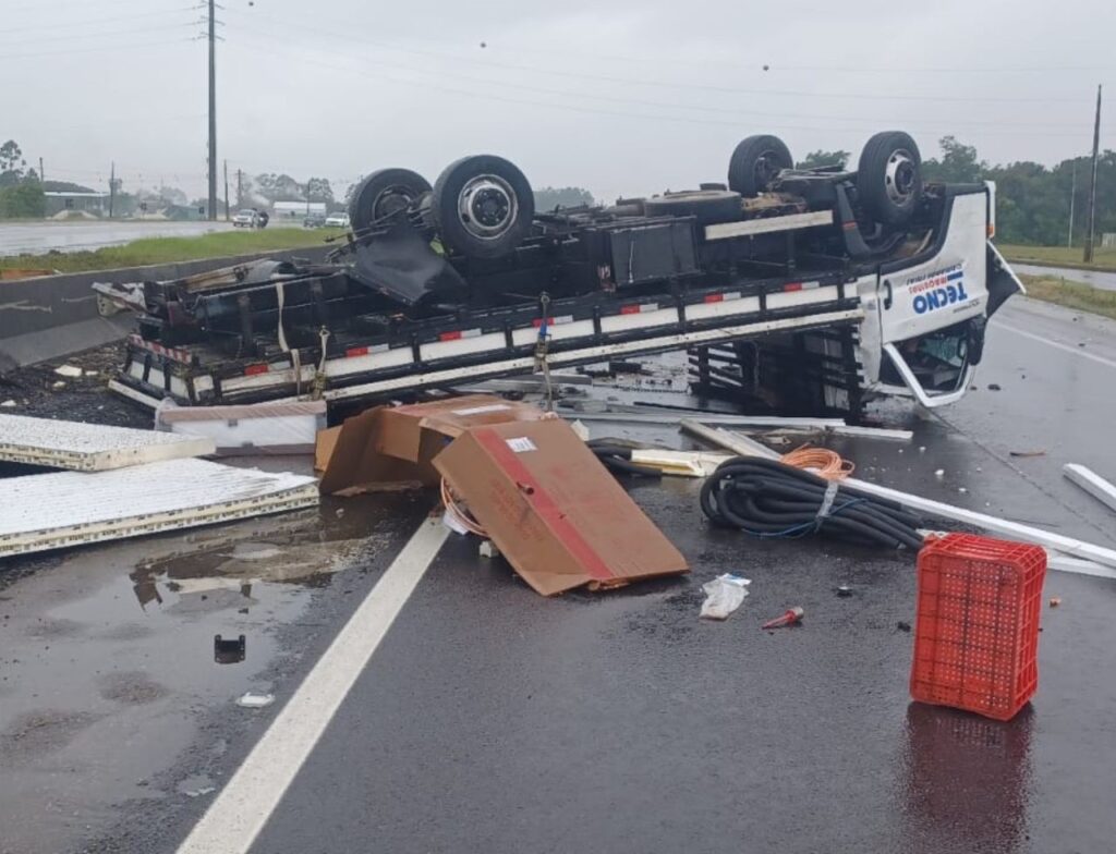 Um acidente de trânsito mobilizou equipes de resgate na BR-101, em Araquari, no final da manhã desta segunda-feira (12). Um caminhão que seguia com destino a Curitiba capotou nas proximidades da fábrica da BMW, atravessou o canteiro central e caiu na pista contrária.