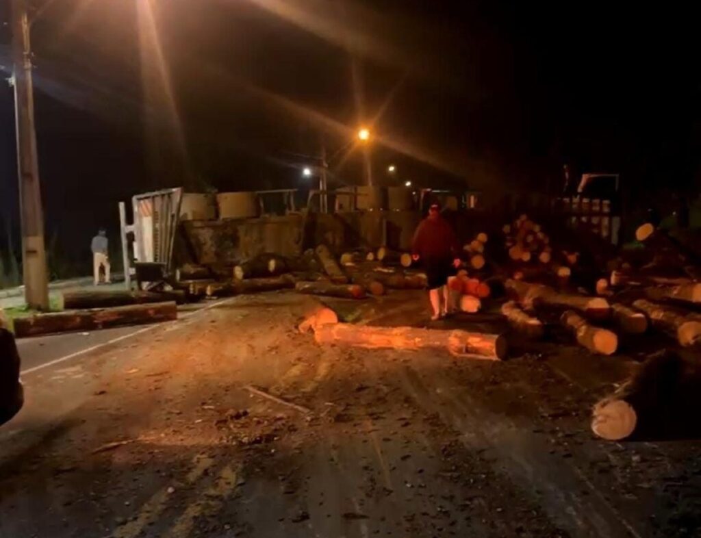 Uma carreta que transportava madeira tombou na noite desta sexta-feira (5) na BR-470, em Apiúna, no Vale do Itajaí, provocando a interdição total da rodovia nos dois sentidos. O acidente aconteceu por volta das 22h, próximo ao antigo posto fiscal.
