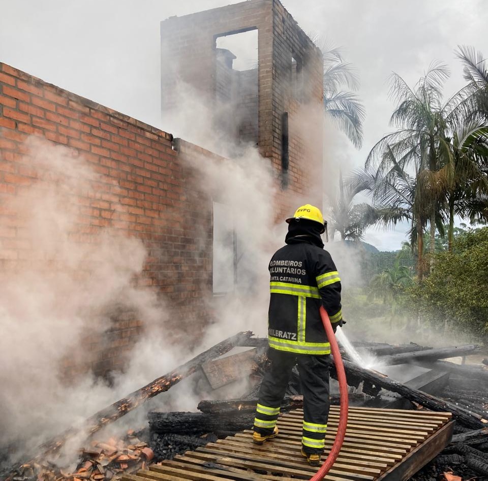 Uma casa de alvenaria de dois andares, com cerca de 240 m², foi completamente tomada pelas chamas na tarde deste sábado (11), na comunidade de Salto Grahl, em Presidente Getúlio.