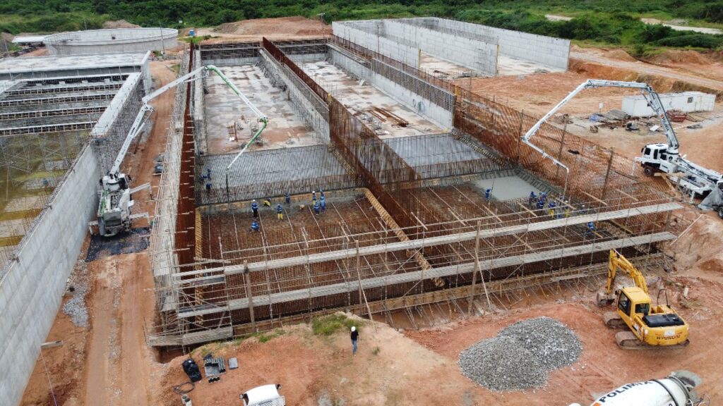 Com a finalização da laje de fundo, o próximo passo será a concretagem das paredes do tanque de aeração. Esse tanque desempenhará um papel essencial no processo de tratamento, fornecendo oxigênio para estimular bactérias que digerem matéria orgânica no esgoto. Essa tecnologia substituirá o antigo sistema de lagoas de estabilização, implementado na década de 1980.