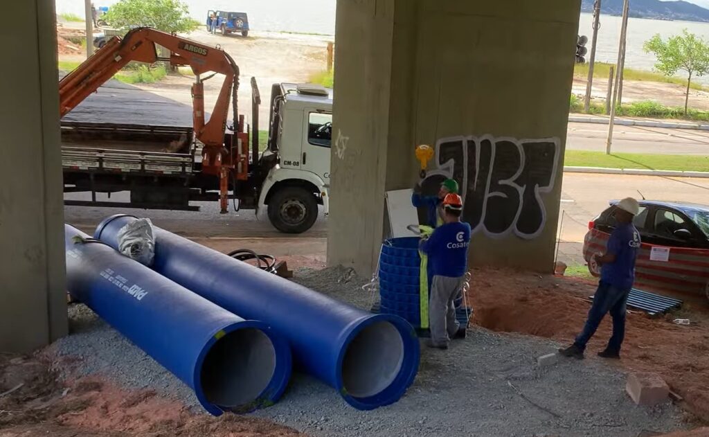 A obra teve início em setembro de 2024, com a instalação de plataformas de segurança, telas de proteção e suportes para fixação dos tubos. Após a conclusão desta etapa, será feita a interligação da adutora ao Sistema Integrado de Abastecimento, que atende várias cidades da região, incluindo Florianópolis, Palhoça e São José. A nova tubulação irá garantir o transporte de água do Continente até a Ilha de Santa Catarina.
