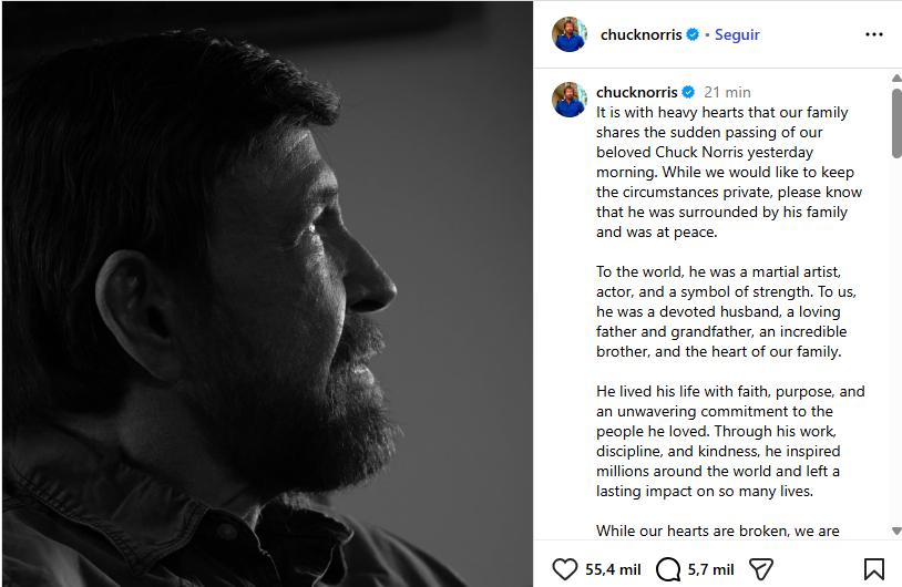“É com o coração pesado que nossa família compartilha o falecimento repentino do nosso amado Chuck Norris ontem de manhã. Embora queiramos manter as circunstâncias em privado, saibam que ele estava cercado por sua família e em paz.