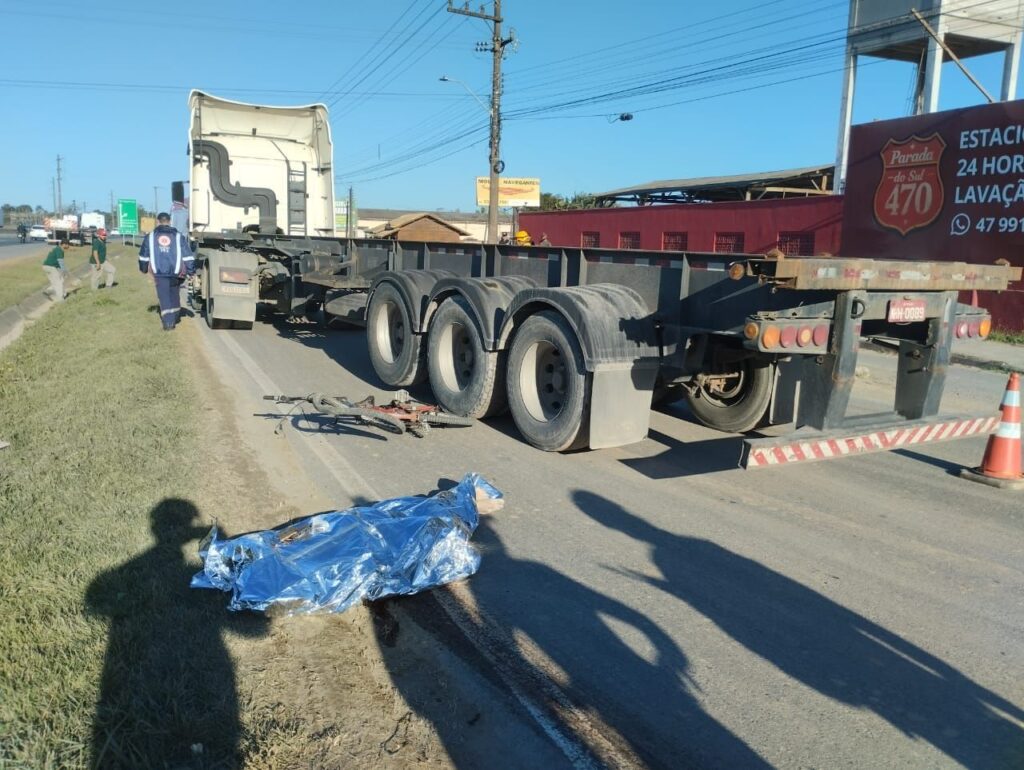 Um grave acidente de trânsito tirou a vida de um ciclista de 59 anos na tarde desta quinta-feira (31), em Navegantes. A ocorrência foi registrada por volta das 15h48, na marginal da BR-470, próximo ao bairro Machados, nas imediações do atacado Fort.