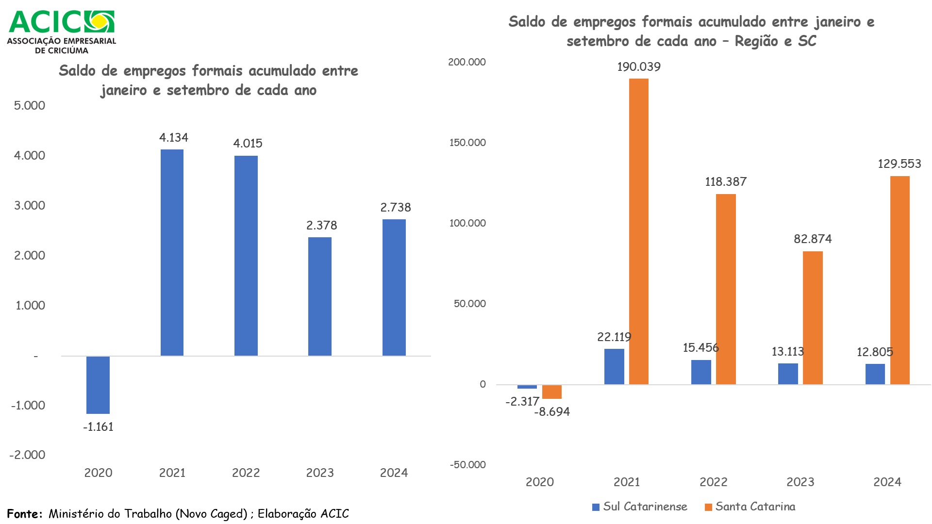O único dado negativo foi a variação de -2,3% na geração de empregos entre janeiro e setembro de 2024, em comparação com 2023. Mas, segundo Gastaldon, “não houve mais demissões que contratações. O saldo de empregos é positivo, mas inferior ao do ano passado. Isso pode ser reflexo de um ritmo mais lento de recuperação em setores específicos”, supõe.