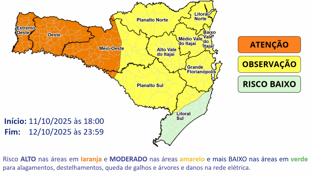 A Secretaria de Estado da Proteção e Defesa Civil de Santa Catarina emitiu, na manhã deste sábado (11), um alerta meteorológico para a ocorrência de temporais e chuva intensa entre a noite de sábado (11) e o domingo (12).