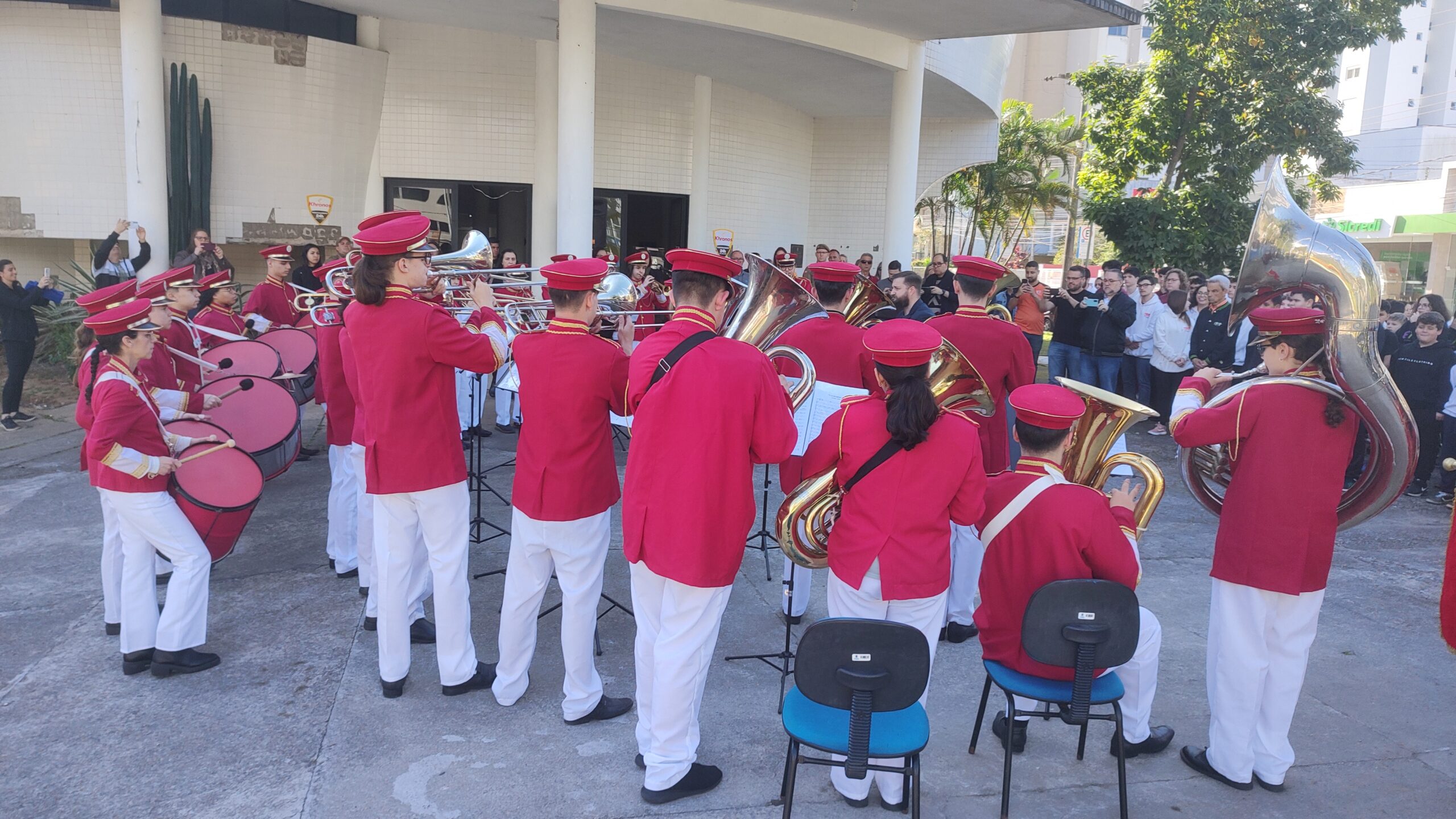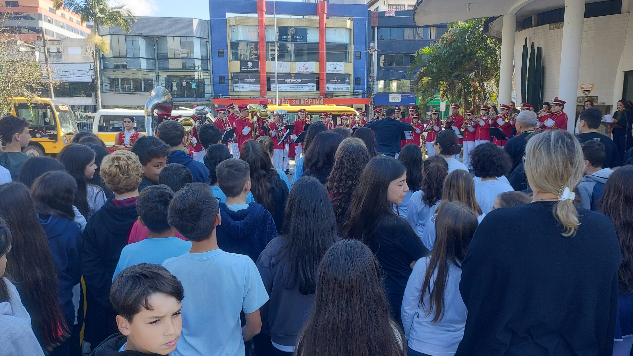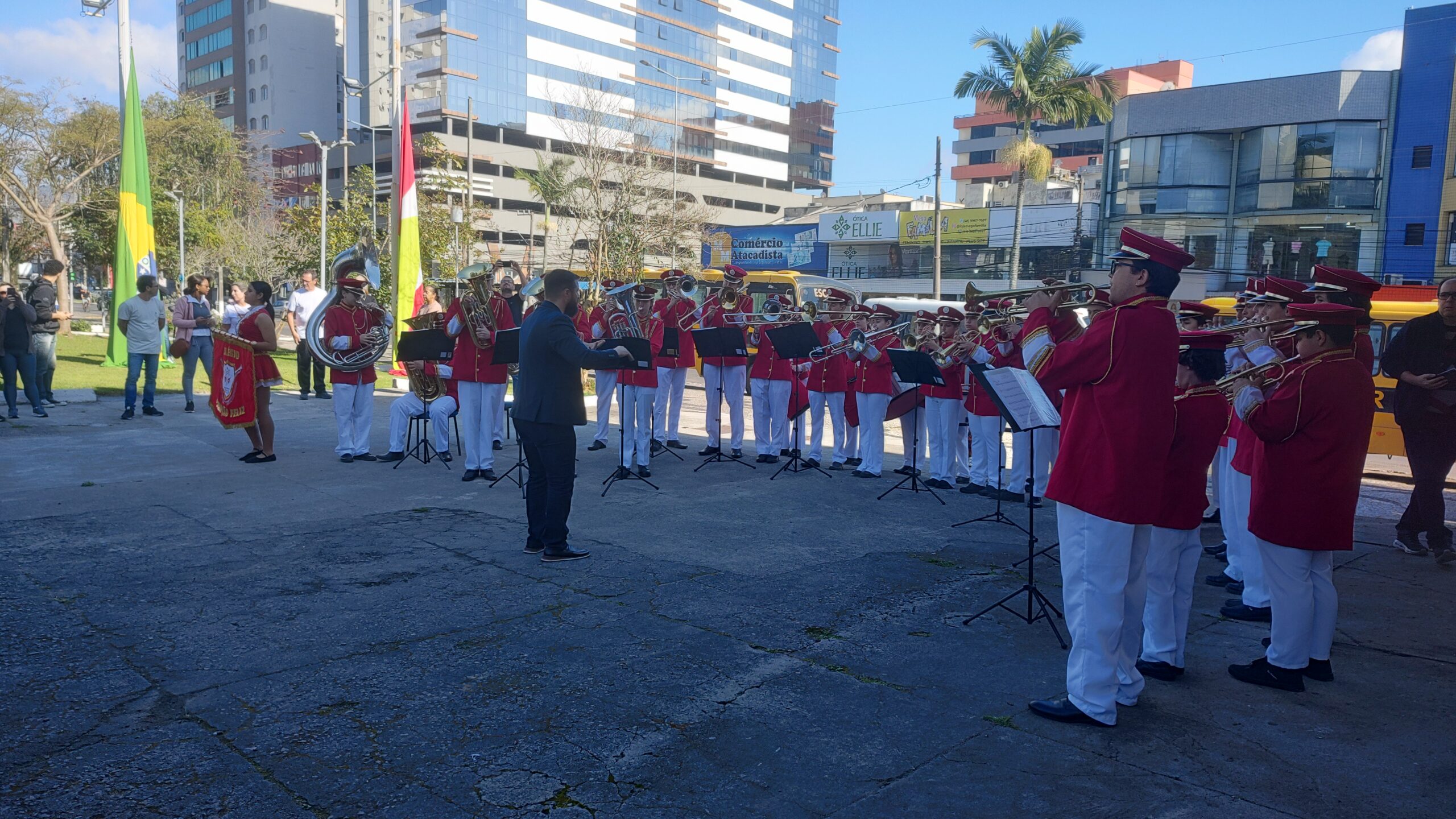 Alunos de algumas escolas de Tubarão se reuniram na Praça Walter Zumblick, no Centro, para participar da abertura da Semana da Pátria nesta segunda-feira (2). Autoridades representando a Polícia Militar e Polícia Civil, assim como a Câmara de Dirigentes Lojistas (CDL), secretários, servidores, diretores escolares e o prefeito Jairo Cascaes (PSD) estiveram prestigiando o ato.