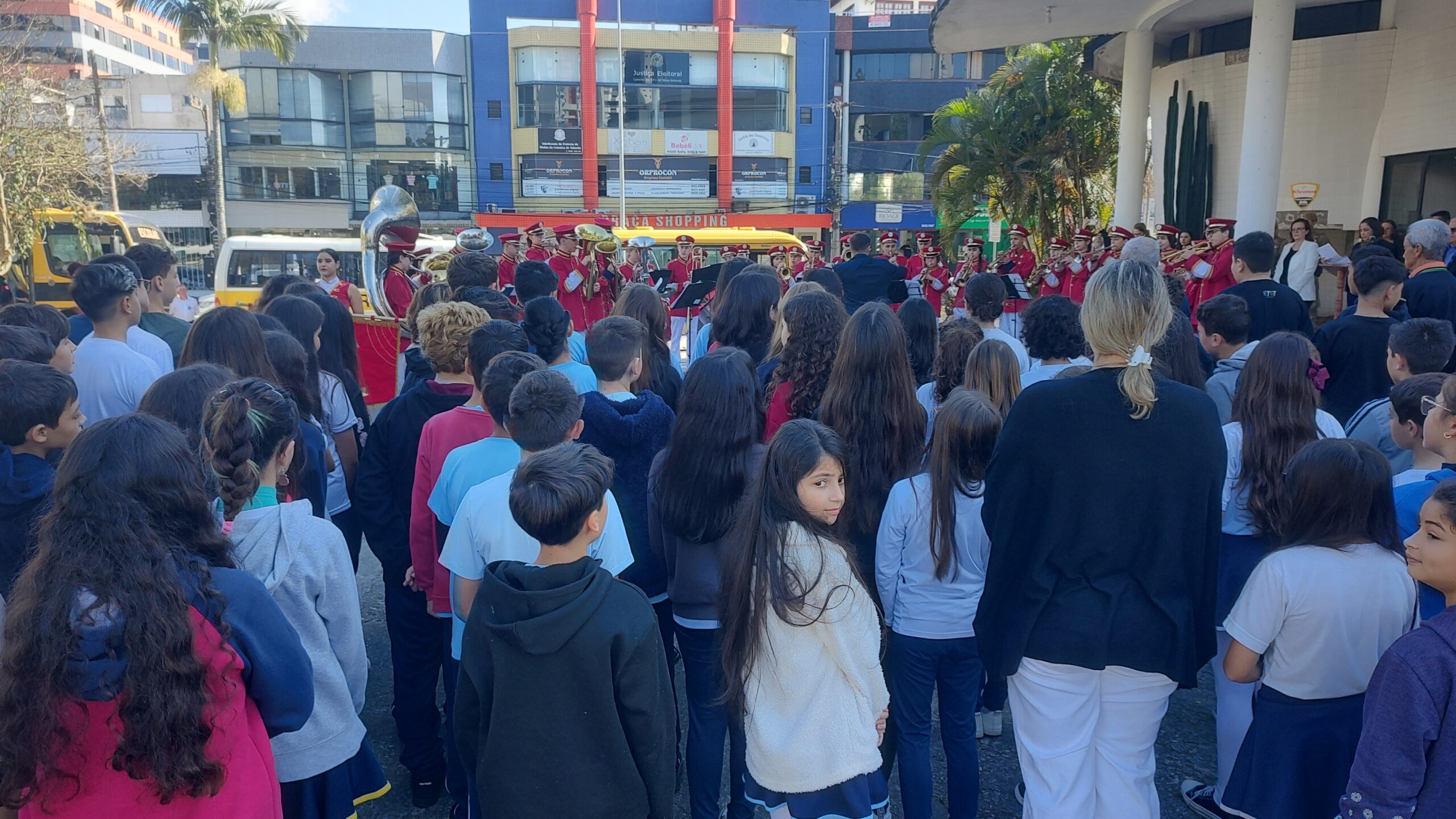 Os estudantes das escolas EMEB Arino Bressan, EMEB João Hilário De Melo, EEB Hercílio Luz, EMEB Presidente Juscelino Kubitscheck, Colégio Coração Feliz, Colégio São José e Escola Técnica de Comércio de Tubarão (ETCT) participaram do ato de hasteamento da bandeira, além de cantar o hino nacional.