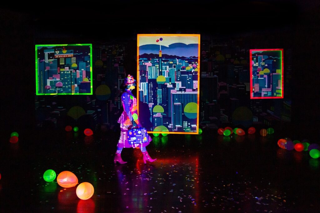 Cenários, luz negra, elementos cênicos, ambientação sonora e imagens criadas por inteligência artificial aliados ao corpo da atriz, ajudam a criar este universo fantástico, que convida a plateia a imaginar suas próprias histórias.