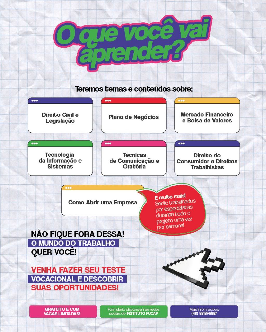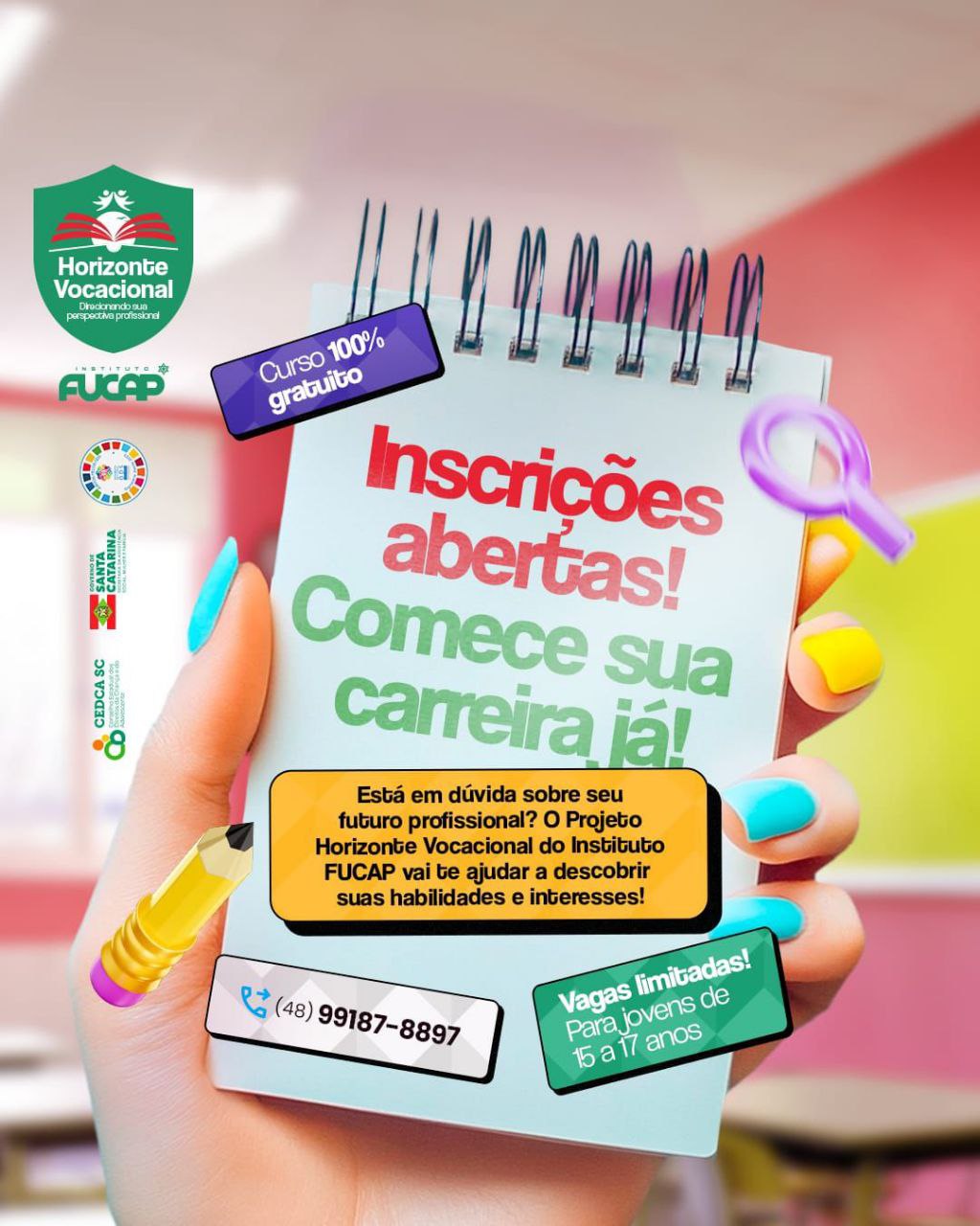 Atualmente o projeto Horizonte Vocacional está em execução e com inscrições abertas. O objetivo do projeto é direcionar a perspectiva profissional do adolescente e tem como público-alvo, jovens de 15 a 17 anos. A inscrição segue aberta até a sexta-feira (21) e podem ser feitas clicando aqui ou presencialmente na sede em Capivari de Baixo, no bairro Santo André.