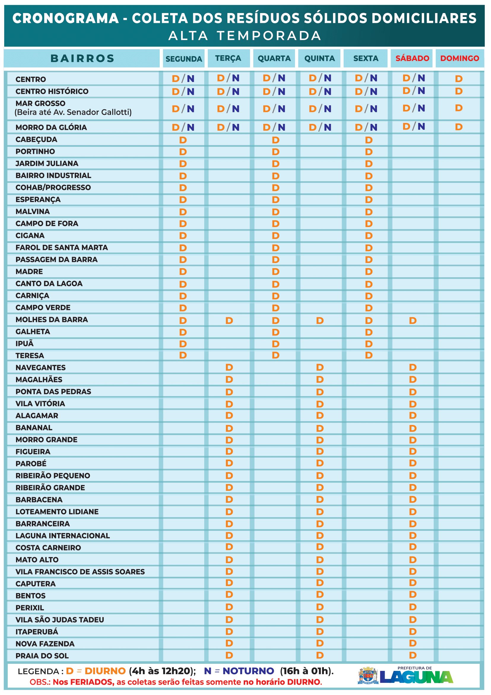 A Prefeitura de Laguna divulgou o cronograma de coleta de resíduos domiciliares que será realizado durante a alta temporada de 2025.