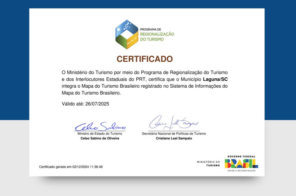 Esta certificação é fruto de um trabalho conjunto entre a Prefeitura Municipal de Laguna e a Secretaria de Turismo e Lazer, que atuam de forma comprometida para valorizar as belezas naturais, a rica história e o potencial turístico da nossa cidade.