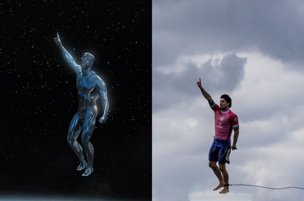 O artista Boss Lógico, transformou a icônica foto do brasileiro Gabriel Medina nas Olimpíadas, em uma arte do super herói da Marvel, Surfista Prateado, que é conhecido das histórias em quadrinhos e filmes do Quarteto Fantástico.