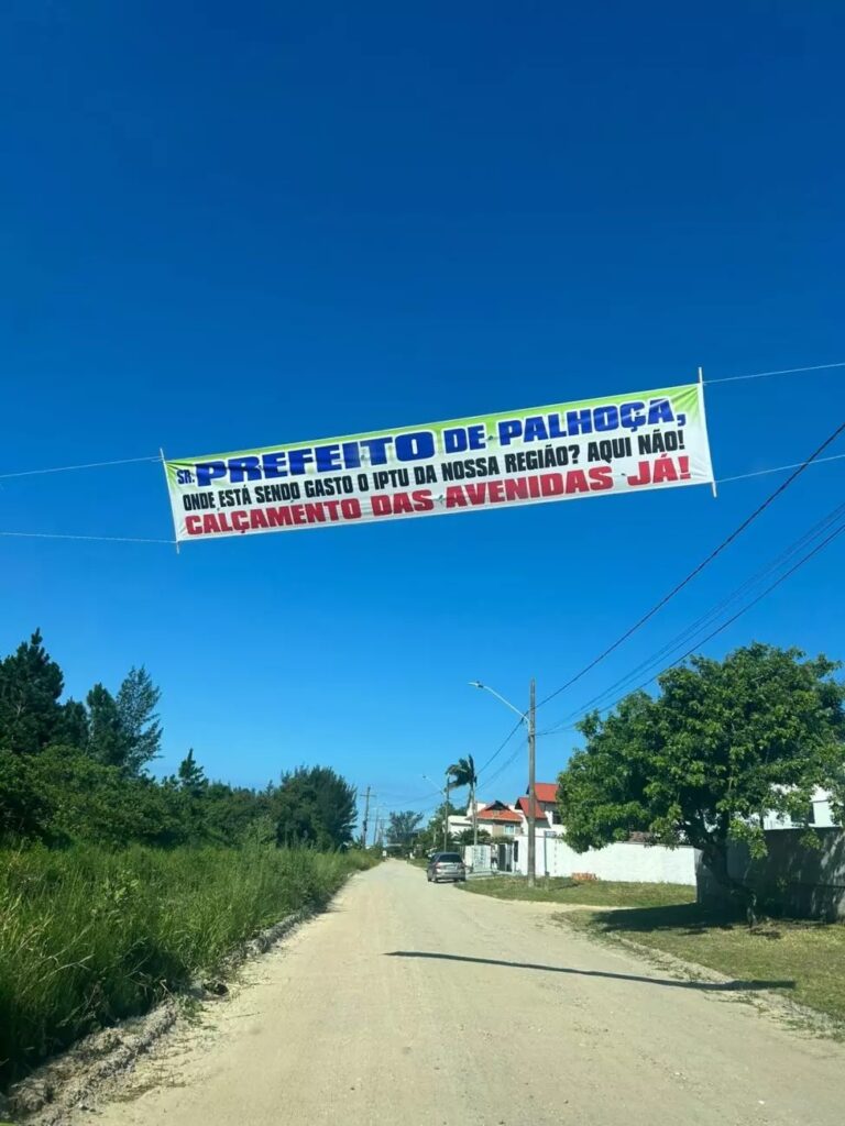 Moradores da região Sul de Palhoça, especialmente na Praia da Pinheira, estão indignados com a falta de calçamento em algumas ruas do bairro. A situação gerou protestos e, ao menos, duas faixas foram colocadas pela comunidade nas vias locais, cobrando uma resposta do prefeito Eduardo Freccia (PL). Uma das faixas questiona diretamente: “Onde está sendo gasto o IPTU da nossa região?”.