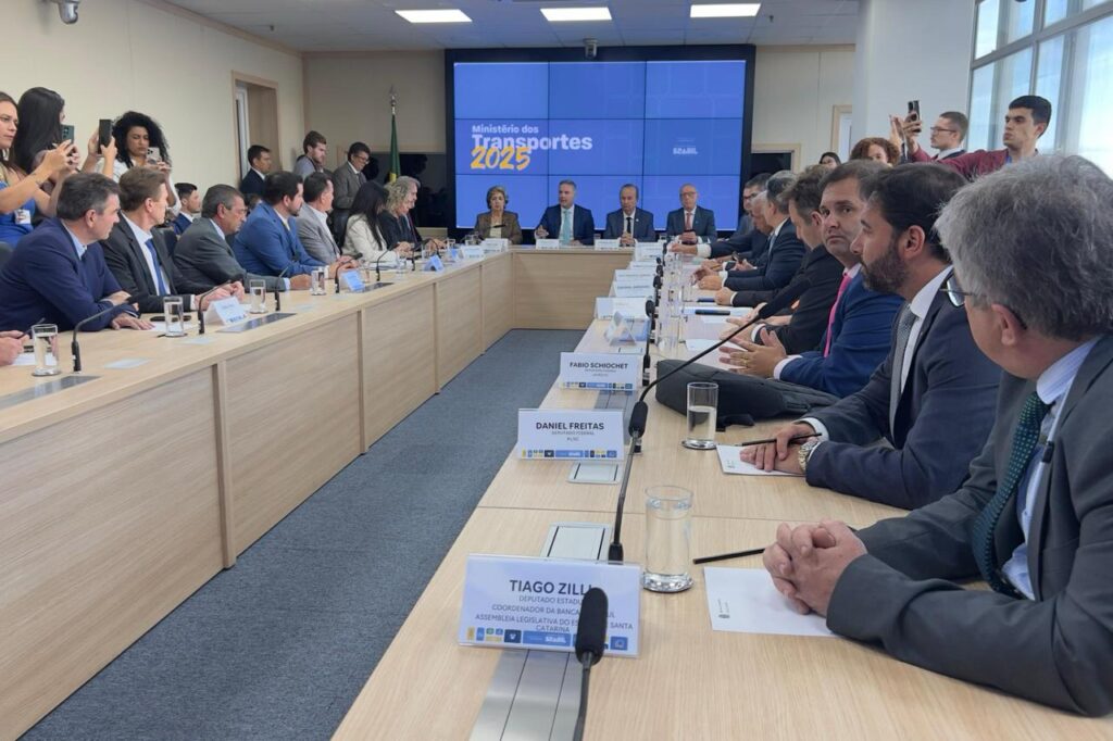 Deputados estaduais de Santa Catarina e autoridades catarinenses participaram, na tarde desta quarta-feira, 23, de audiência com o ministro dos Transportes, Renan Filho, na busca de uma solução para os problemas do trecho da Rodovia BR-101 conhecido como Morro dos Cavalos, em Palhoça, na Grande Florianópolis. O encontro foi realizado na sede do Ministério dos Transportes, em Brasília.