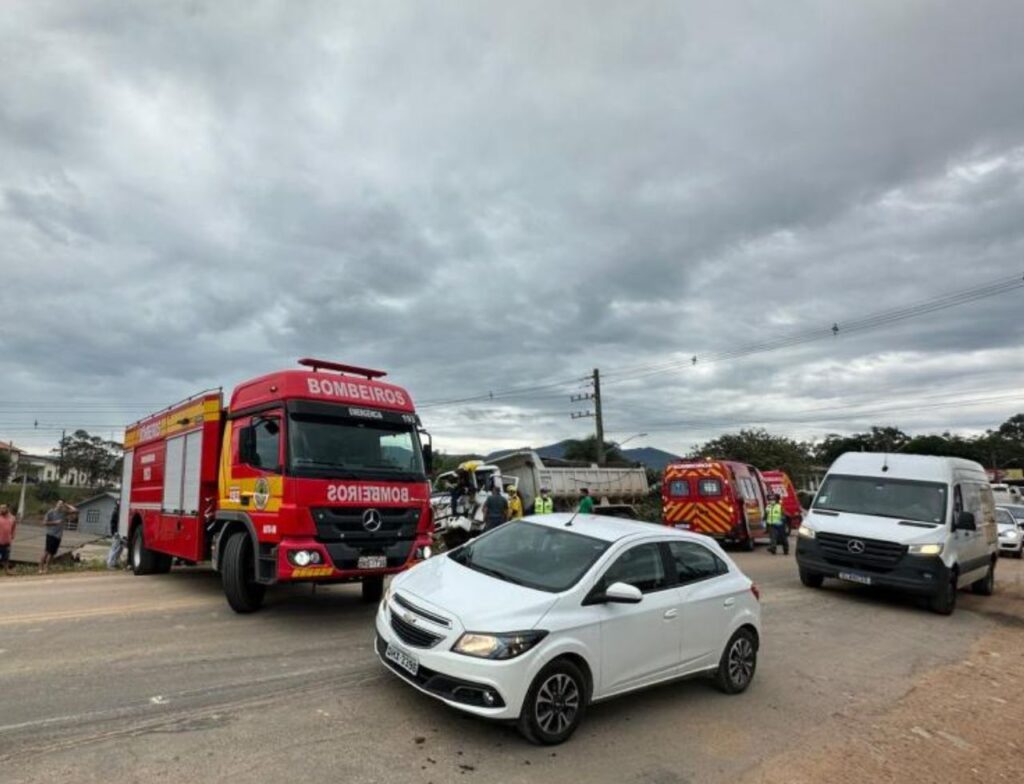Um acidente grave mobilizou equipes de resgate na manhã desta terça-feira (3), em Tijucas, na Grande Florianópolis. A colisão ocorreu por volta das 11h40 na SC-410, no bairro Nova Descoberta, e deixou o motorista de uma caçamba preso às ferragens com ferimentos graves.