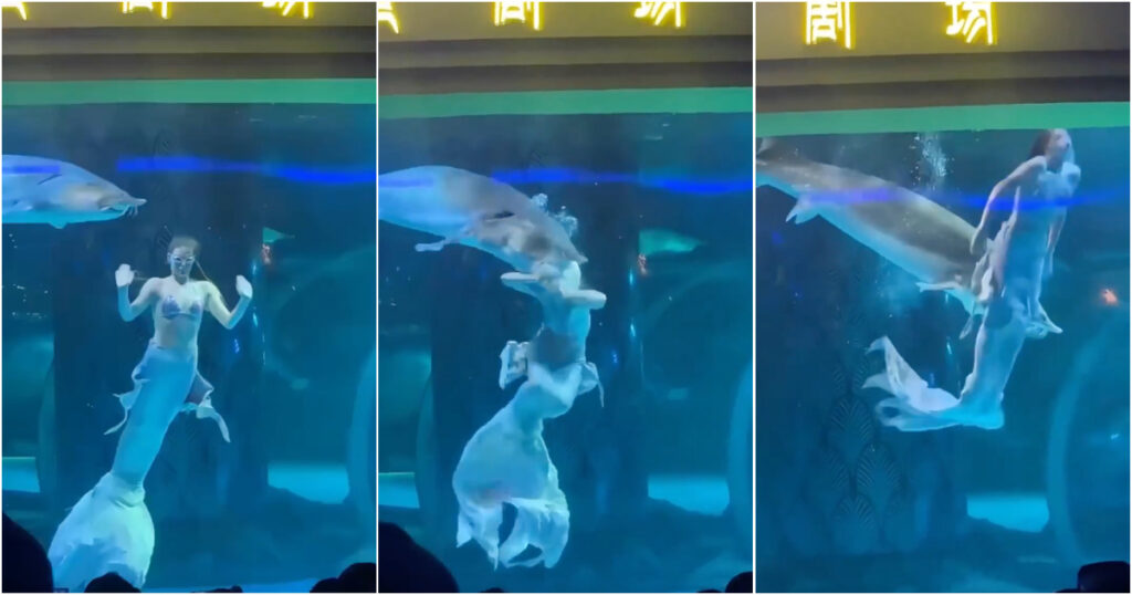 Durante uma apresentação no aquário Xishuangbanna Primitive Forest Park, na China, a artista russa Masha, de 22 anos, passou por um susto ao ser atacada por um peixe gigante enquanto se apresentava como sereia. Ela estava nadando e acenando para o público quando o animal surgiu e mordeu sua cabeça.