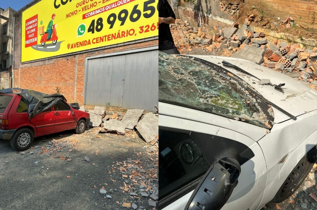 Queda de muro provoca danos em três automóveis em estacionamento no Centro de Criciúma