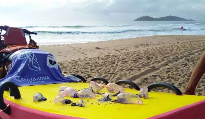 Para alertar os banhistas sobre a presença de águas-vivas, a bandeira lilás é sinalizada nas praias do litoral catarinense. Quando essa bandeira estiver hasteada, a recomendação é clara: não entrar no mar e evitar andar descalço na areia. Isso porque os tentáculos da caravela-portuguesa, que podem atingir até 50 metros de comprimento, ficam submersos na água e são venenosos.