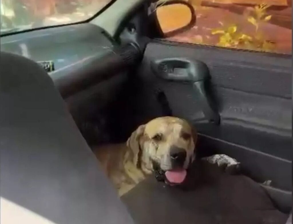 Populares resgataram um cachorro de grande porte que foi deixado em um carro estacionado na rua Porto Alegre, no Centro de Penha, na manhã desta terça-feira (1).