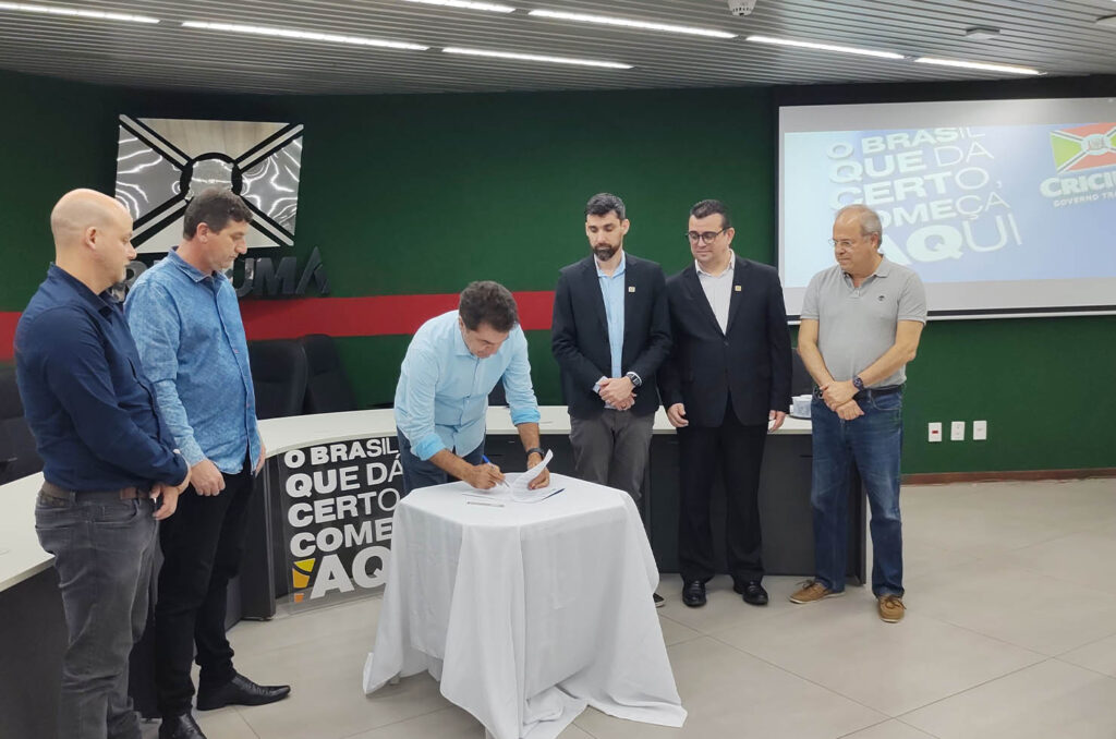 O Governo de Criciúma realizou, nesta terça-feira (19), a assinatura da ordem de serviço para o início das obras da terceira etapa do Binário da Avenida Santos Dumont. Durante o ato, foi realizado também o sancionamento da Lei n° 8.660/2024, que institui as faixas de preservação permanente das bacias hidrográficas em Criciúma. O evento aconteceu no Salão Ouro Negro do Paço Municipal Marcos Rovaris.