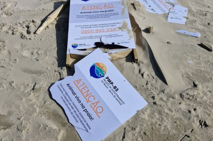 No entanto, ao retornar ao local nesta sexta (16), a equipe identificou que os ferros do isolamento foram roubados, uma placa informativa foi vandalizada e havia marcas profundas de pneus de automóvel ao redor da área onde o animal descansava, indicando manobras perigosas e desrespeitosas próximas à foca.