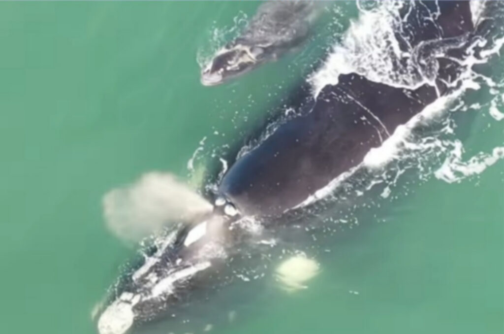 Com aproximadamente quatro metros de comprimento e cerca de cinco toneladas, o filhote apresentava pele acinzentada e marcas suaves — sinais claros de que tem apenas poucos dias de vida. Ele foi flagrado nadando ao lado da mãe, em um comportamento típico da espécie durante os primeiros meses de vida, período em que o bebê depende exclusivamente do leite materno.