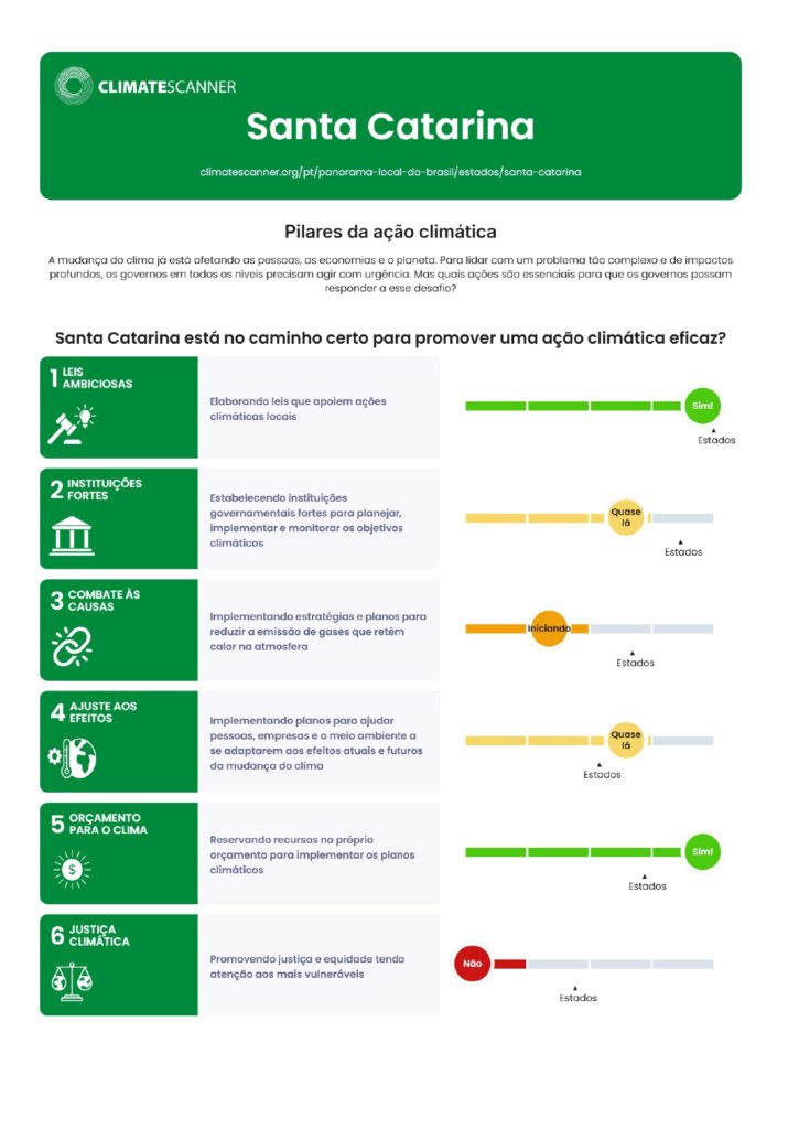 O relatório específico de Santa Catarina, disponível no documento “Pilares da Ação Climática – Santa Catarina” , destaca que o Estado está inserido na avaliação nacional que considera três grandes dimensões: governança climática, mitigação e adaptação. Esses pilares permitem verificar o nível de estruturação das políticas públicas, além de indicar o grau de alinhamento às recomendações internacionais.