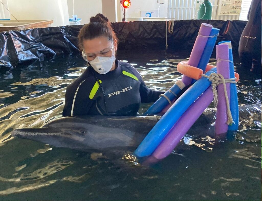 Debilitado, o animal está sendo monitorado por biólogos e veterinários 24h por dia e recebendo hidratação e medicaçãoDevido ao estado de saúde do golfinho, após retirá-lo da água, a equipe o encaminhou para a Unidade de Estabilização de Animais Marinhos em Penha, para receber um melhor atendimento da equipe veterinária. O animal está sendo monitorado 24h por dia e recebendo hidratação e medicação.