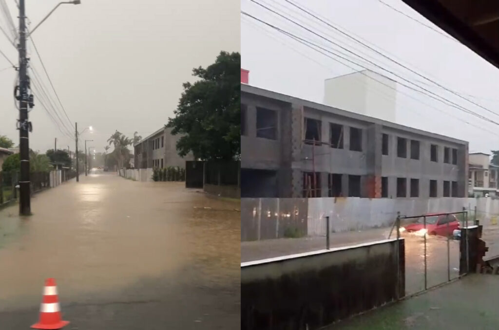 “Em poucas horas de chuva… Com a construção do colegio ao lado os alagamentos estão mais rápidos. Moradores saindo de casa por não saberem até onde pode chegar o alagamento após essa construção”, diz um dos moradores locais. Veja: