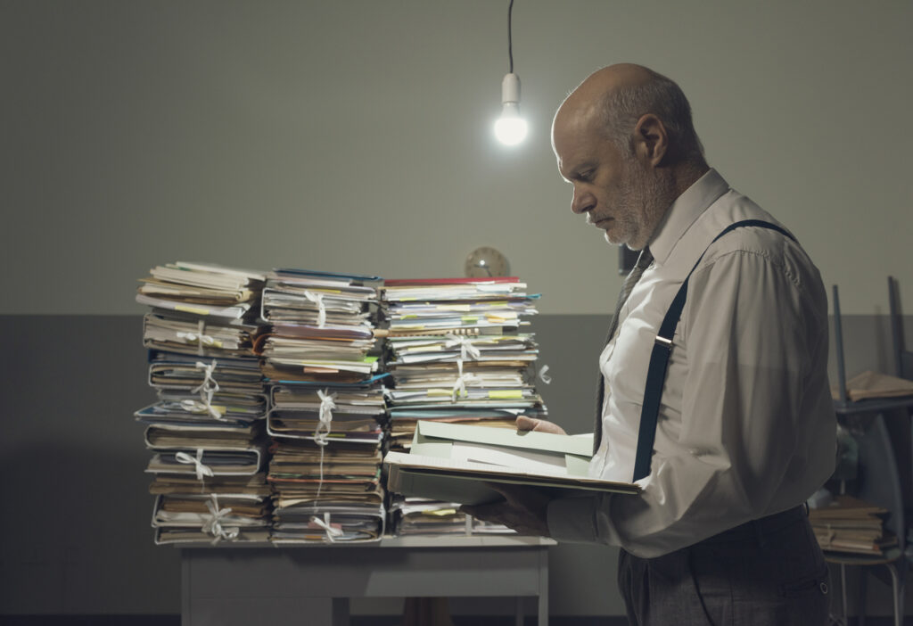 Serious pensive businessman checking a file in a vintage style office and piles of paperwork, business and administration concept