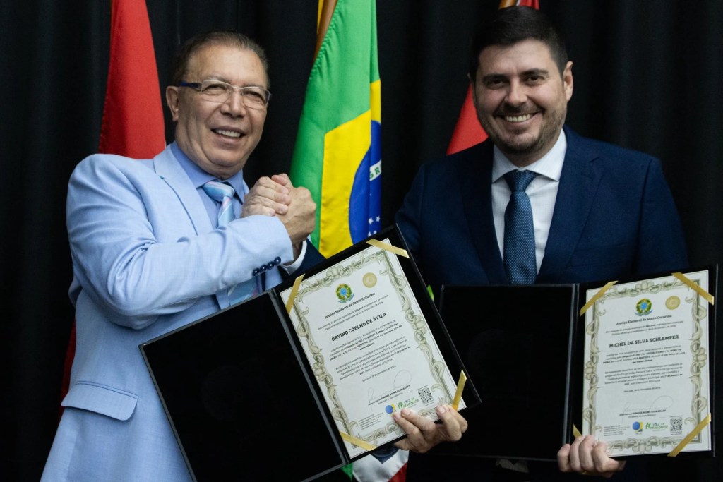 Reeleitos para o mandato de 2025 a 2028, o prefeito Orvino Coelho de Ávila e o vice Michel Schlemper foram diplomados nesta quarta-feira (18), em São José. A cerimônia, realizada no auditório da escola municipal Maria Luiza de Melo, no Kobrasol, também diplomou os vereadores eleitos.
