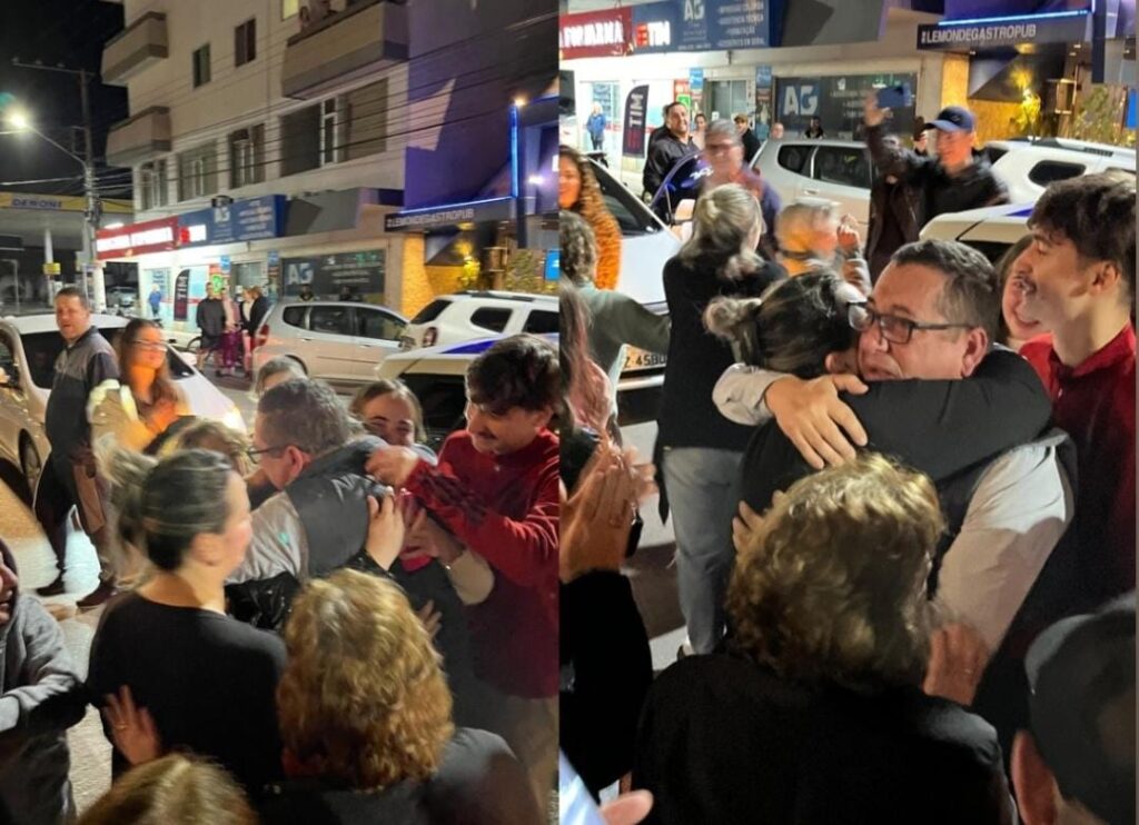 Dezenas de pessoas se reuniram na noite desta quinta-feira, 18, para receber o prefeito de Cocal do Sul Fernando de Faveri após ter a sua soltura determinada pela Justiça, nesta tarde.