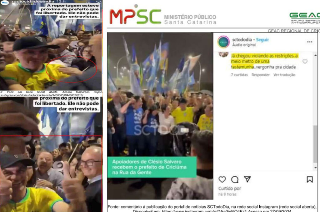 Porém, no vídeo (live) feito no dia em que ele chegou em Criciúma após ser solto do presídio de Itajaí, os promotores flagraram através da live da Rádio Cidade em Dia esse corréu/testemunha do processo a poucos metros do prefeito.